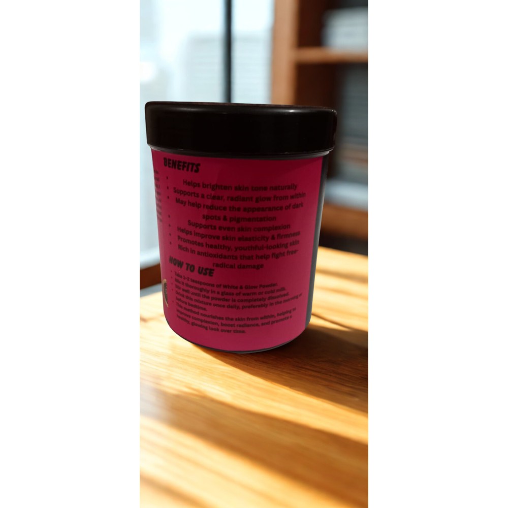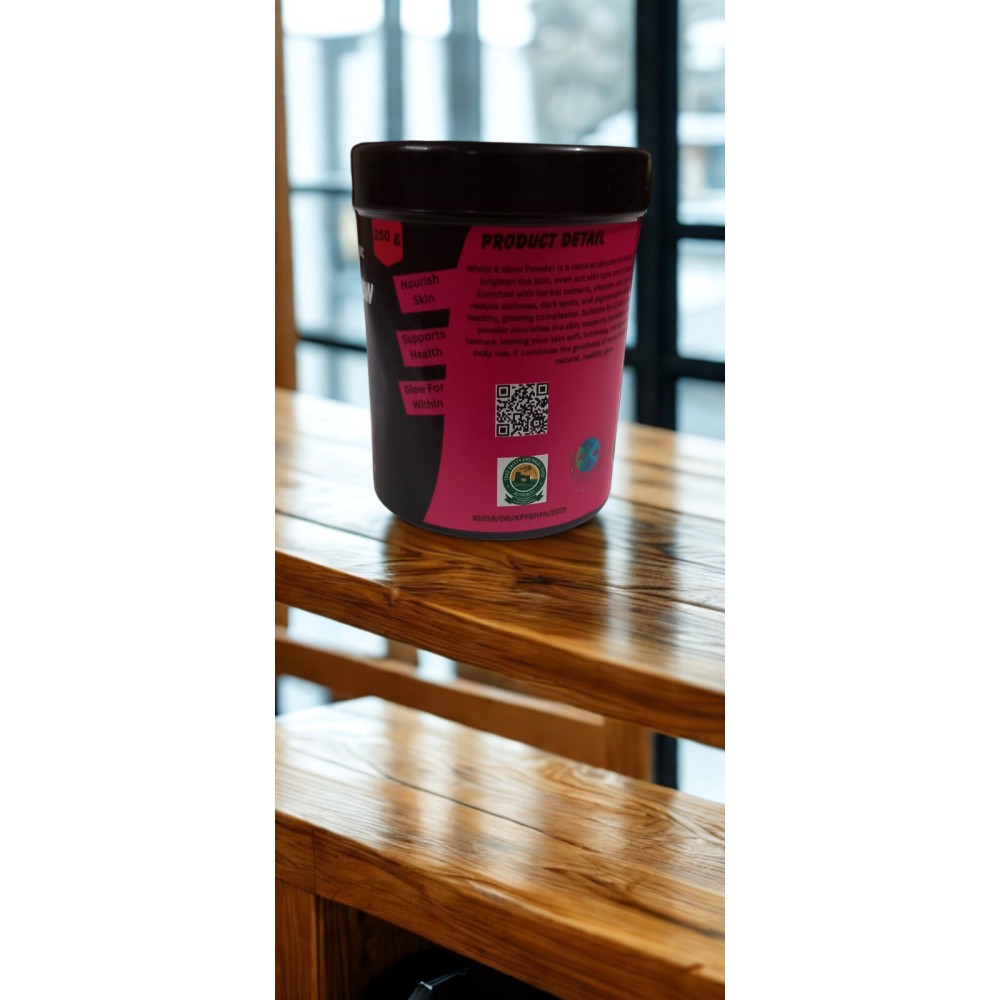 White & Glow Powder is a natural skincare formulation designed to brighten the skin, even out skin tone, and enhance radiance. Enriched with herbal extracts, vitamins, and minerals, it helps reduce dullness, dark spots, and pigmentation while promoting a healthy, glowing complexion. Suitable for all skin types, this gentle powder nourishes the skin, supports hydration, and improves texture, leaving your skin soft, luminous, and rejuvenated. Ideal for daily use, it combines the goodness of nature to give your skin a natural, healthy glow.